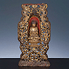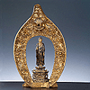 oft von einer Strahlenmandorla umgeben und auf einem Lotus-Sockel